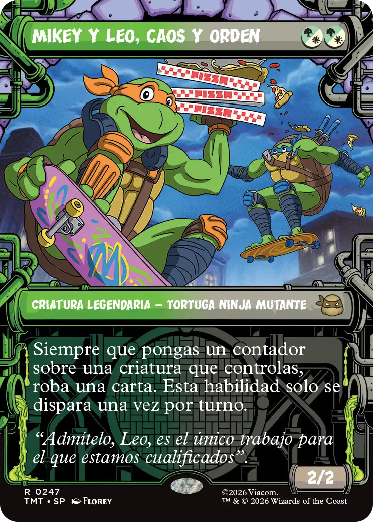 Mutágeno incorpora una nueva ficha de artefacto que permite fortalecer criaturas mediante contadores +1/+1. Su diseño conecta directamente con el “ooze” que originó a los personajes y se integra con estrategias que interactúan con artefactos o crecimiento progresivo de criaturas.